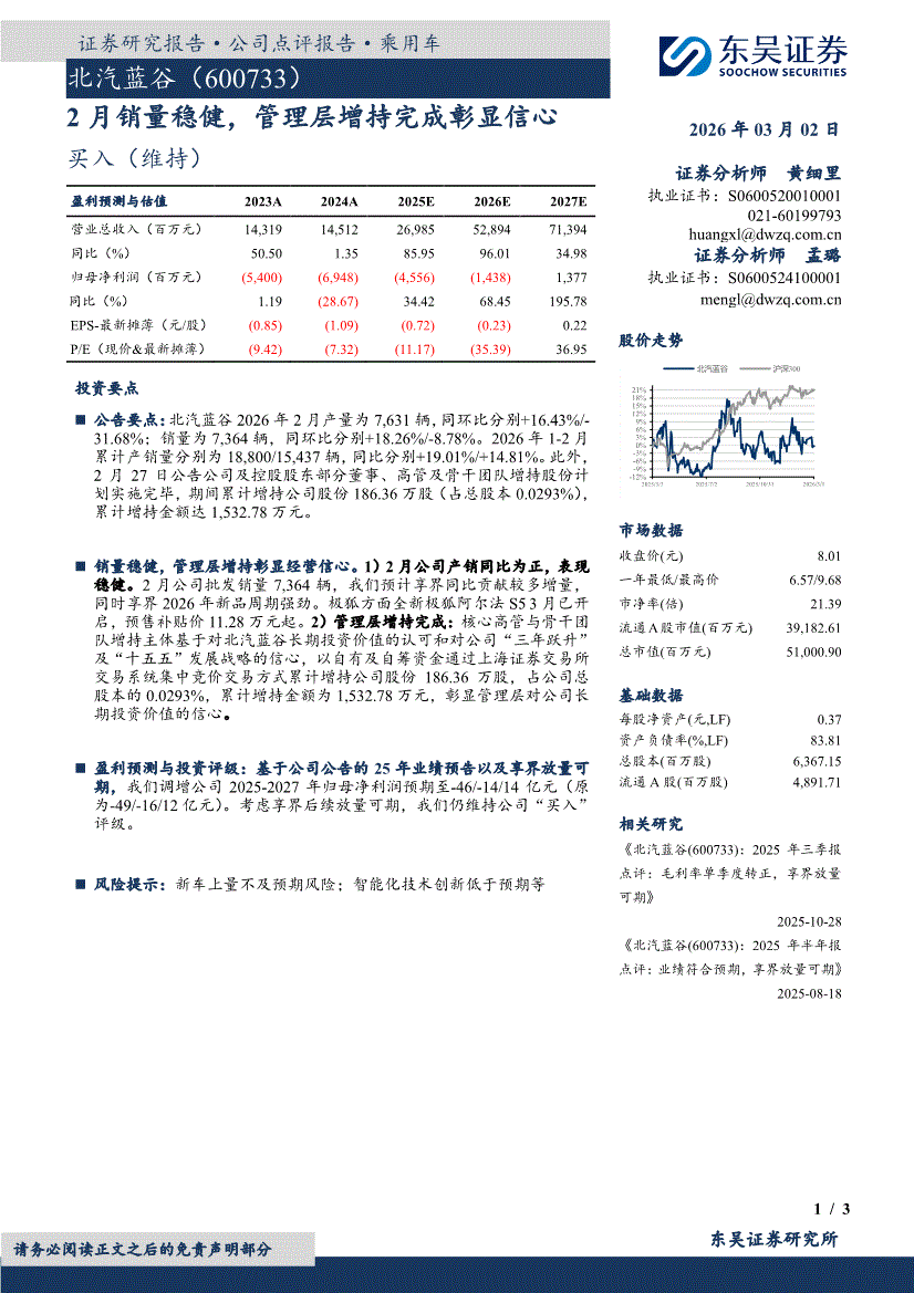 北汽蓝谷:东吴证券-北汽蓝谷-600733-2月销量稳健,管理层增持完成彰显信心-260302