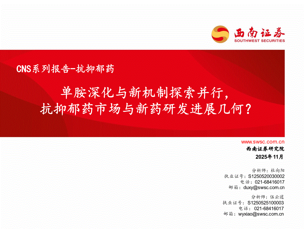 医药行业:西南证券-医药行业CNS系列报告~抗抑郁药:单胺深化与新机制探索并行,抗抑郁药市场与新药研发进展几何?-251114