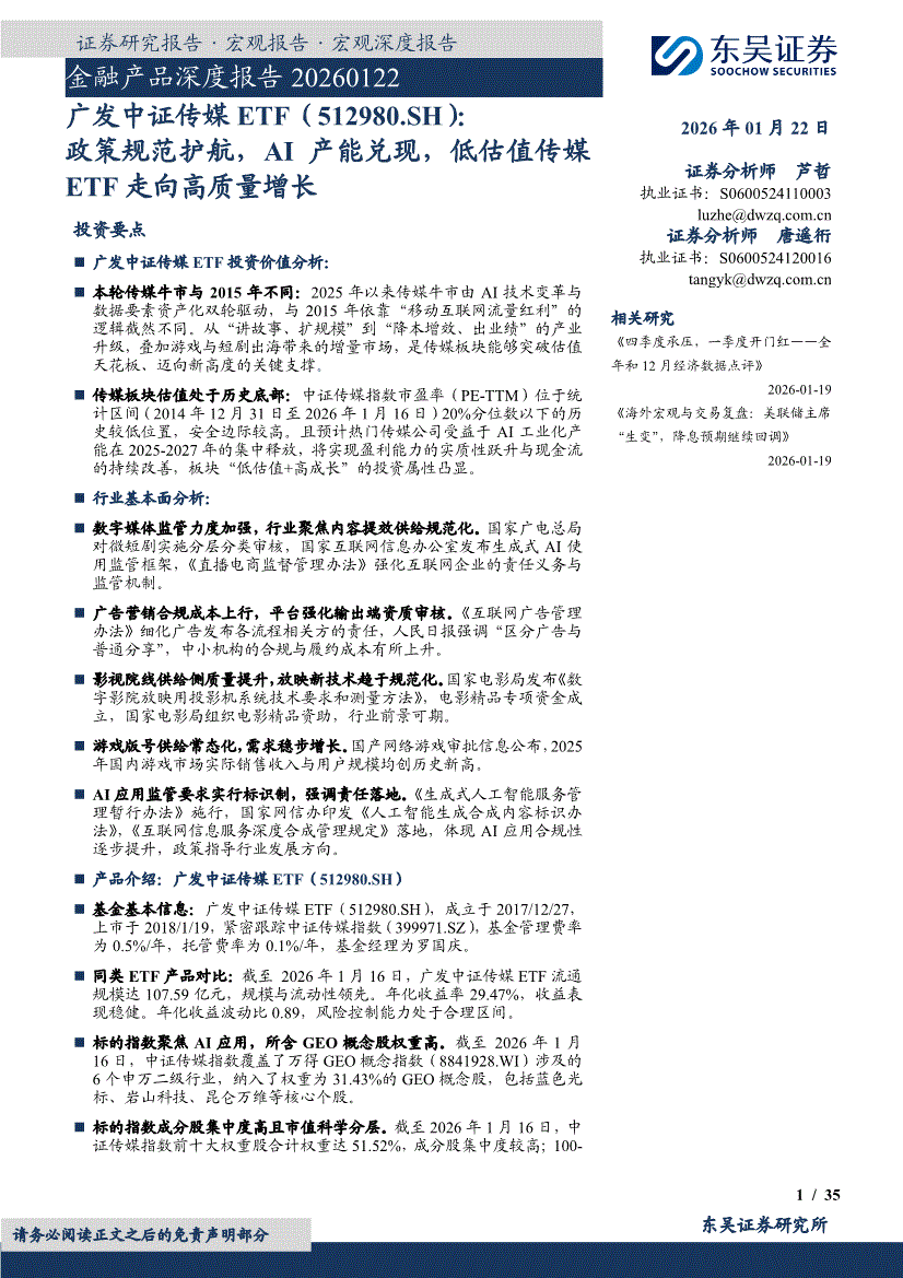 东吴证券-金融产品深度报告:广发中证传媒ETF(512980.SH),政策规范护航,AI产能兑现,低估值传媒ETF走向高质量增长-260122