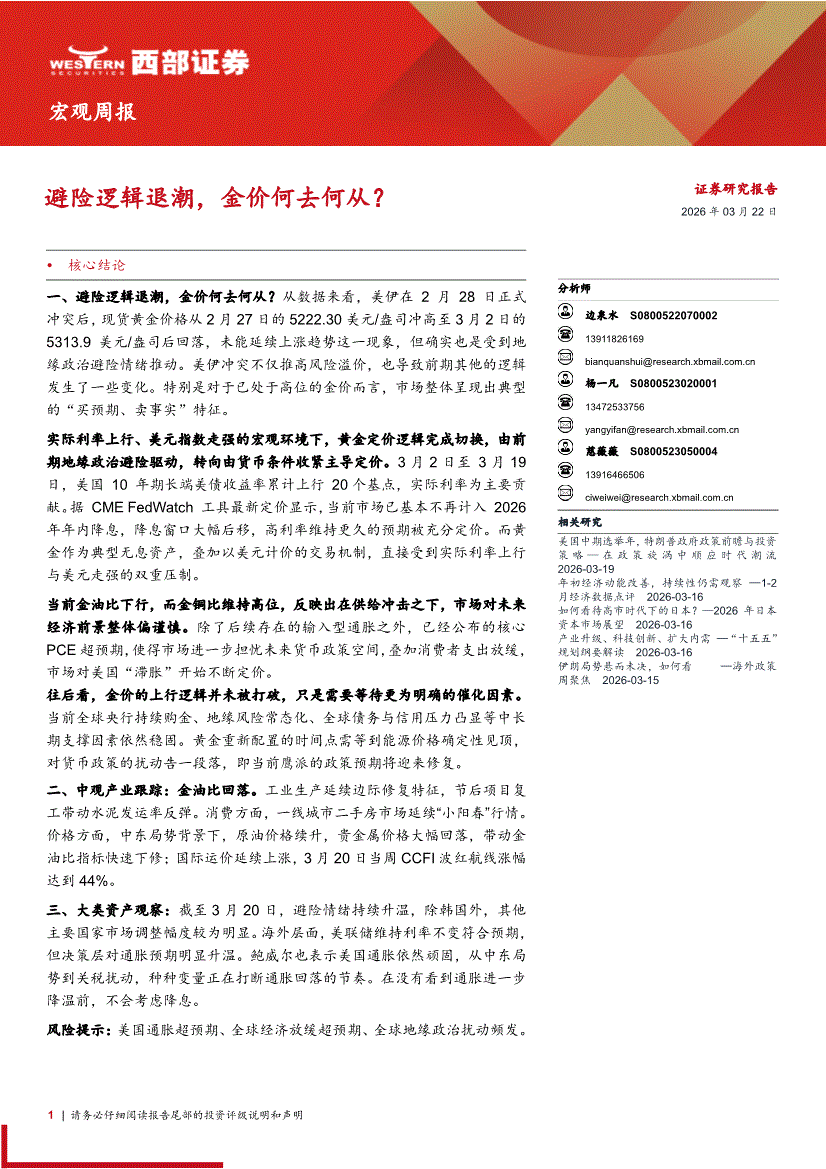 西部证券-宏观周报:避险逻辑退潮,金价何去何从?-260322