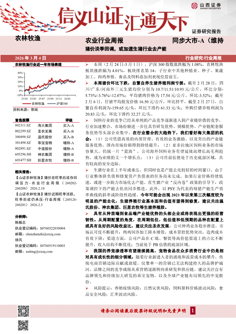 农业:山西证券-农业行业周报:猪价淡季回调,或加速生猪行业去产能-260304