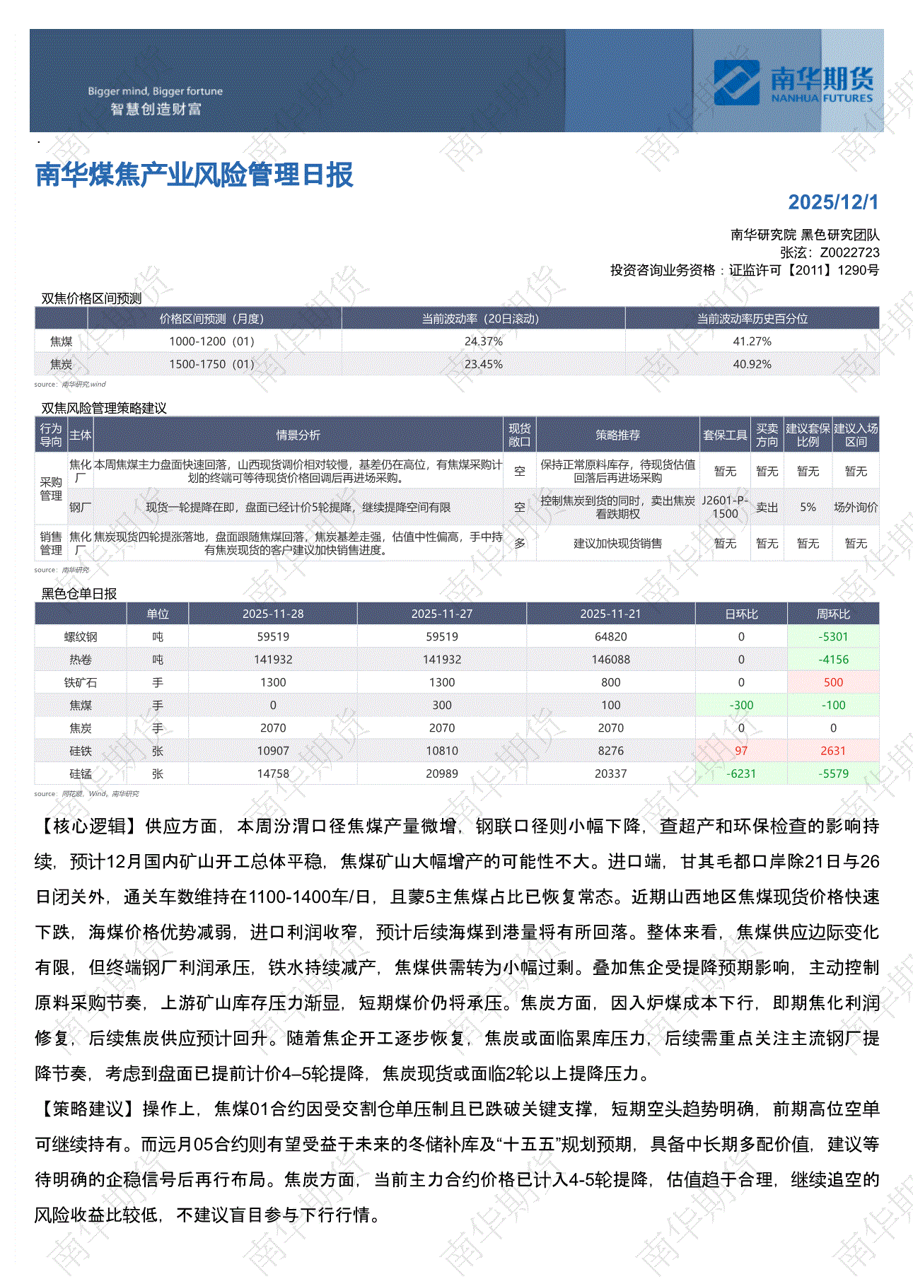 南华期货-煤焦产业周报:现货估值偏高,终端采购放缓-251114