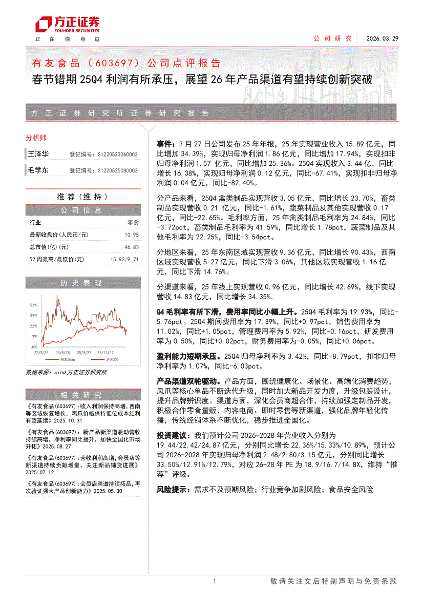 有友食品:方正证券-有友食品-603697-公司点评报告:春节错期25Q4利润有所承压,展望26年产品渠道有望持续创新突破-260329