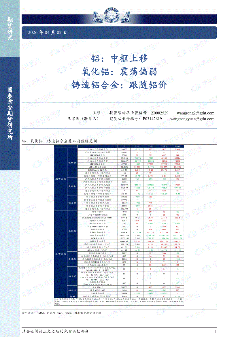 国泰君安期货-铝:中枢上移,氧化铝,震荡偏弱,铸造铝合金,跟随铝价-260402