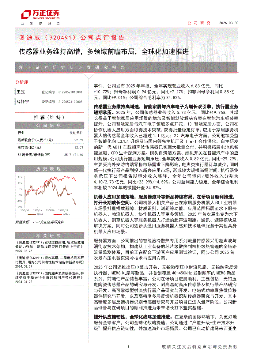 奥迪威:方正证券-奥迪威-920491-公司点评报告:传感器业务维持高增,多领域前瞻布局,全球化加速推进-260330