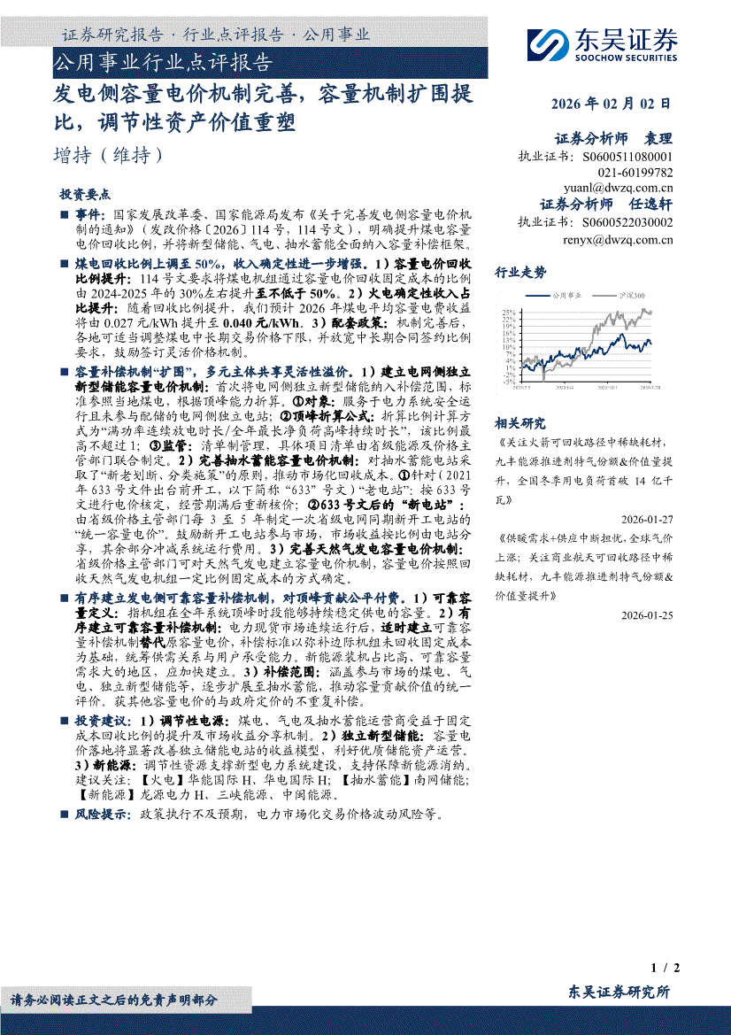 公用事业行业:东吴证券-公用事业行业点评报告:发电侧容量电价机制完善,容量机制扩围提比,调节性资产价值重塑-260202