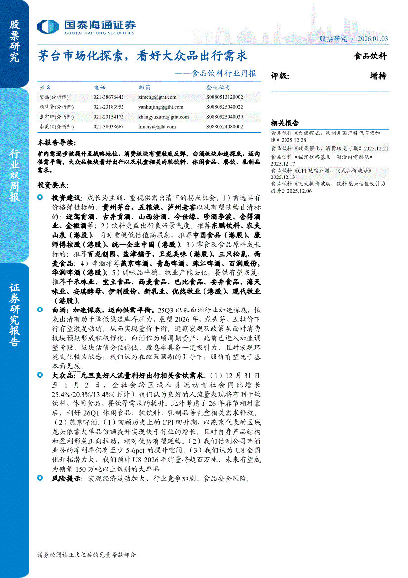 食品饮料行业:国泰海通证券-食品饮料行业周报:茅台市场化探索,看好大众品出行需求-260103