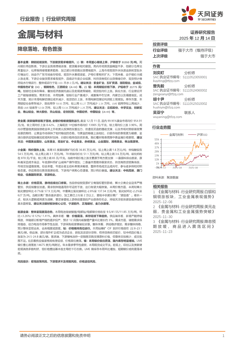 金属与材料行业:天风证券-金属与材料行业研究周报:降息落地,有色普涨-251214