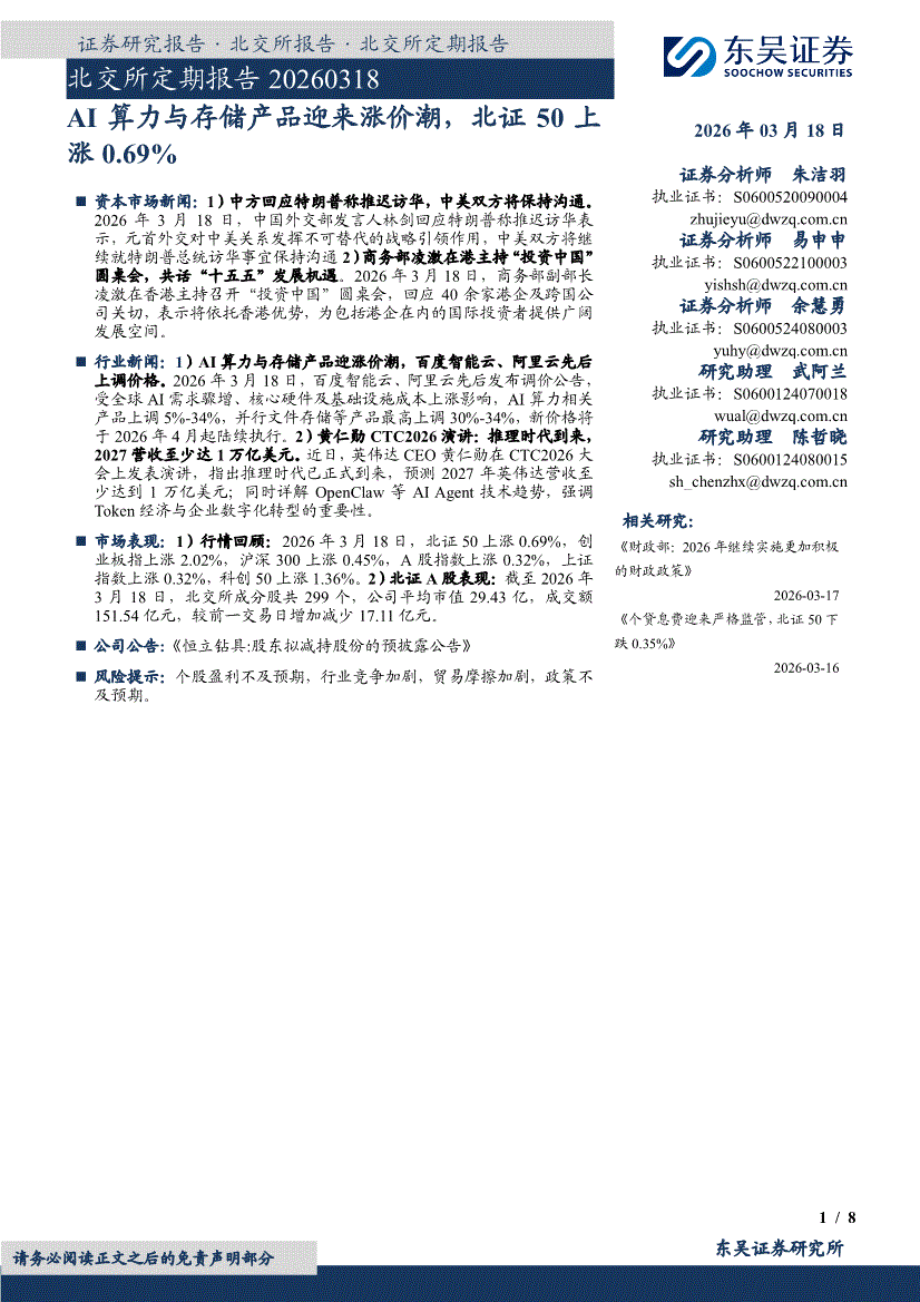 东吴证券-北交所定期报告:AI算力与存储产品迎来涨价潮,北证50上涨0.69%-260318