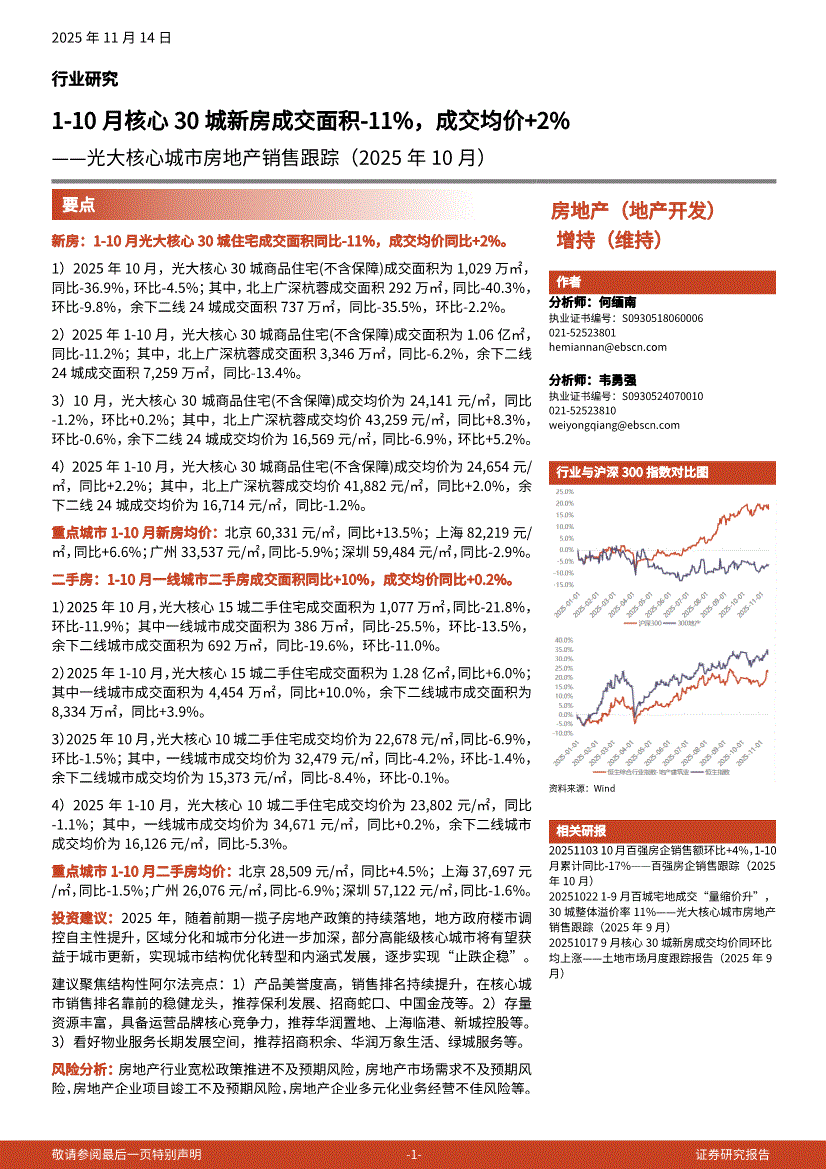 房地产行业:光大证券-房地产行业核心城市房地产销售跟踪(2025年10月):1~10月核心30城新房成交面积减少11%,成交均价+2%-251114