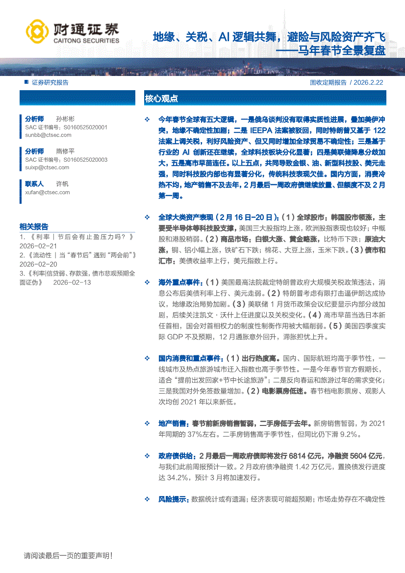 财通证券-马年春节全景复盘:地缘、关税、AI逻辑共舞,避险与风险资产齐飞-260222