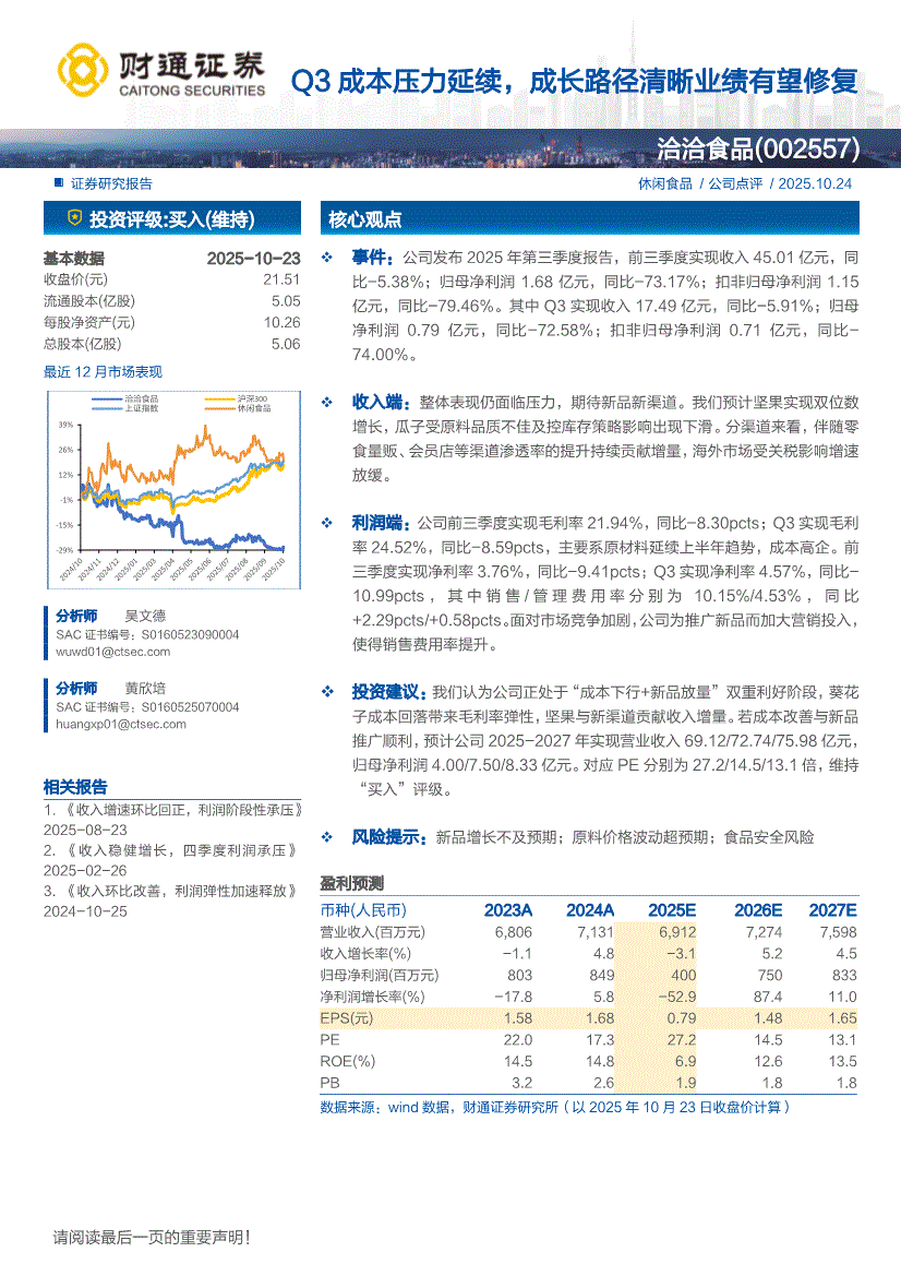 洽洽食品:财通证券-洽洽食品-002557-Q3成本压力延续,成长路径清晰业绩有望修复-251024