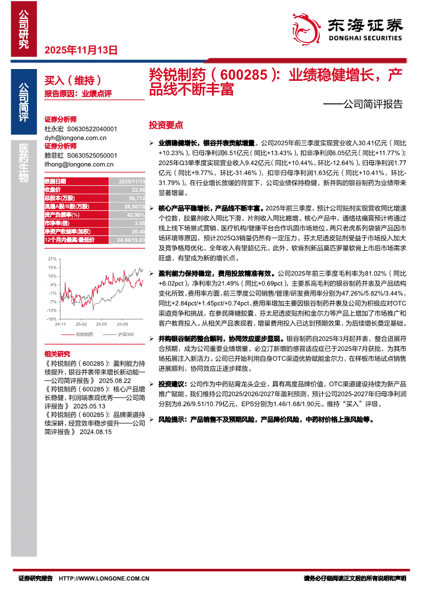 羚锐制药:东海证券-羚锐制药-600285-公司简评报告:业绩稳健增长,产品线不断丰富-251113