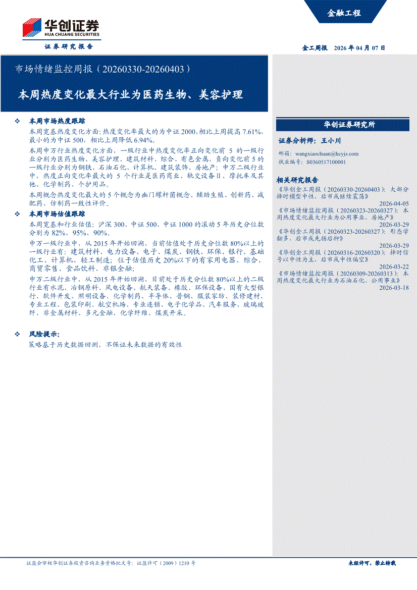 华创证券-市场情绪监控周报(20260330~20260403):本周热度变化最大行业为医药生物、美容护理-260407