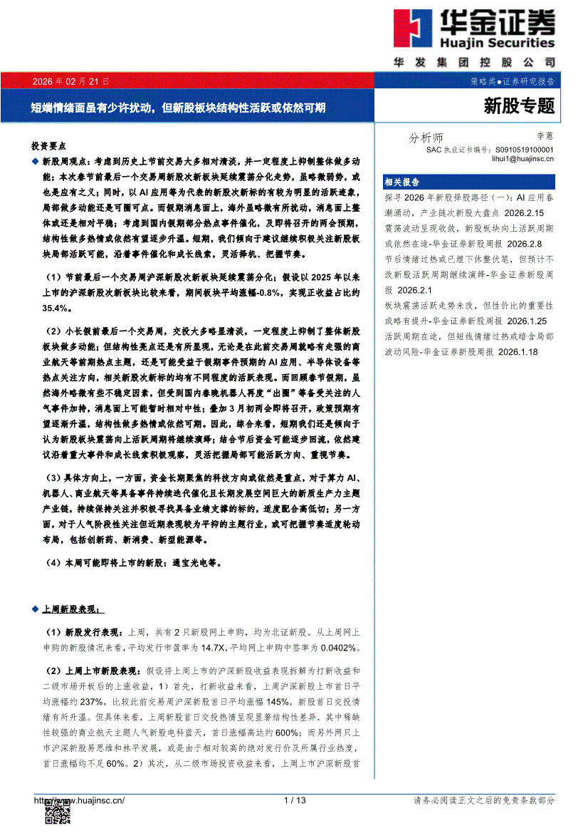 华金证券-新股专题:短端情绪面虽有少许扰动,但新股板块结构性活跃或依然可期-260221