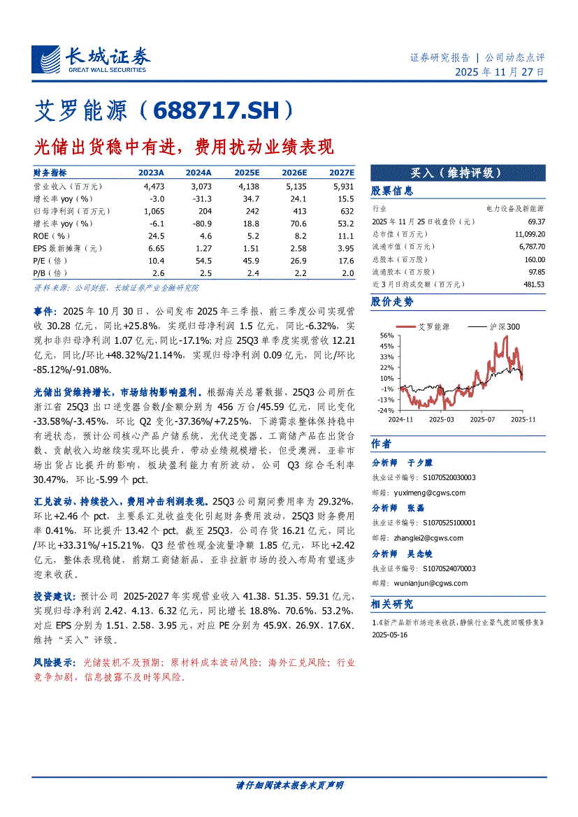艾罗能源:长城证券-艾罗能源-688717-光储出货稳中有进,费用扰动业绩表现-251127