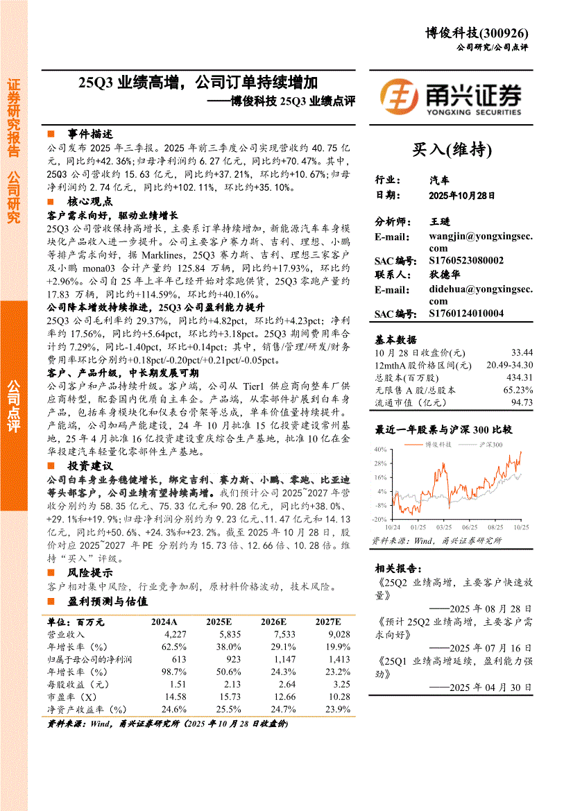 博俊科技:甬兴证券-博俊科技-300926-25Q3业绩点评:25Q3业绩高增,公司订单持续增加-251028