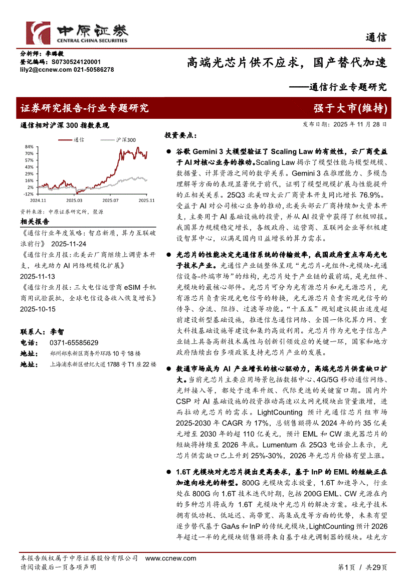 通信行业:中原证券-通信行业专题研究:高端光芯片供不应求,国产替代加速-251128