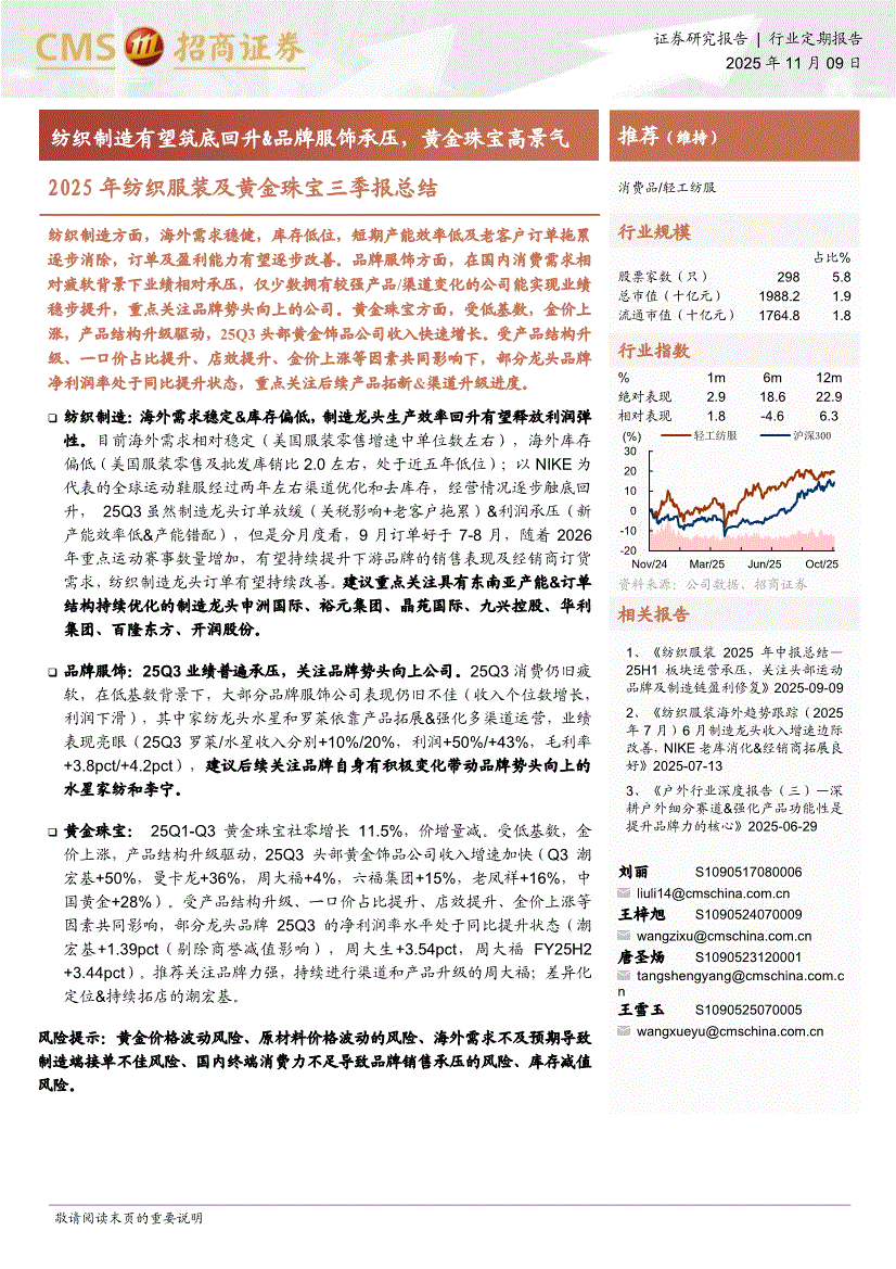 纺织服装及黄金珠宝行业:招商证券-2025年纺织服装及黄金珠宝行业三季报总结:纺织制造有望筑底回升&品牌服饰承压,黄金珠宝高景气-251109