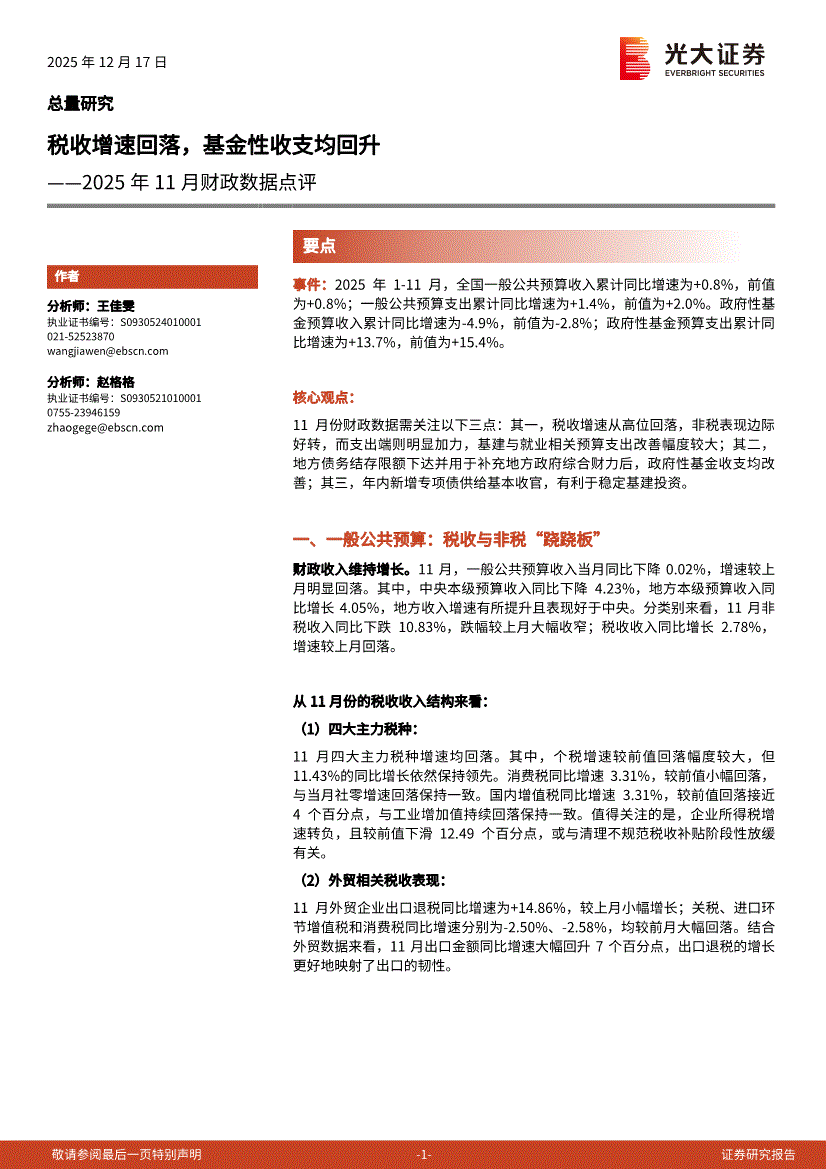 光大证券-2025年11月财政数据点评:税收增速回落,基金性收支均回升-251217