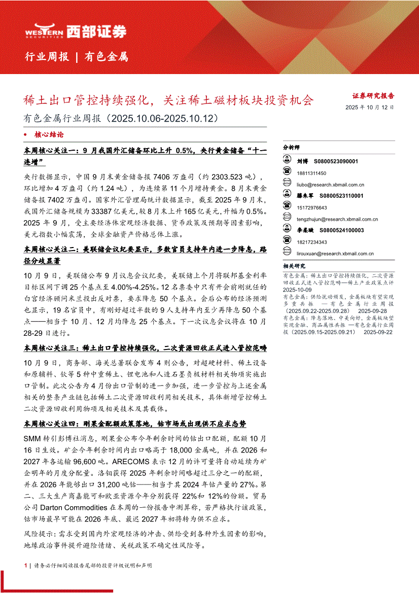 有色金属行业:西部证券-有色金属行业周报:稀土出口管控持续强化,关注稀土磁材板块投资机会-251012