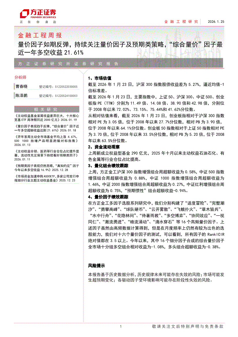 方正证券-金融工程周报:量价因子如期反弹,持续关注量价因子及预期类策略,“综合量价”因子最近一年多空收益21.61%-260125