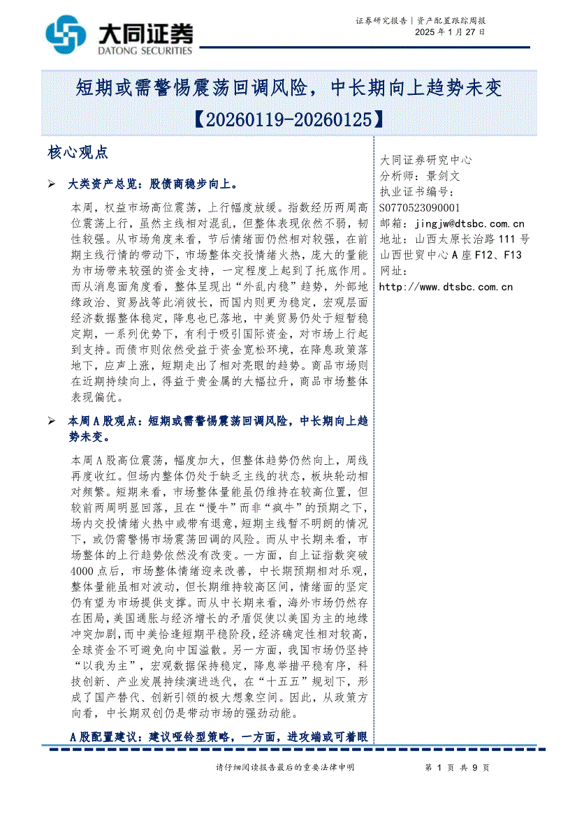大同证券-资产配置跟踪周报:短期或需警惕震荡回调风险,中长期向上趋势未变-260127