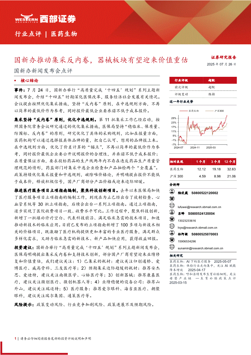 医药生物行业:西部证券-医药生物行业国新办新闻发布会点评:国新办推动集采反内卷,器械板块有望迎来价值重估-250726