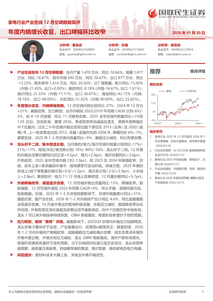 家电行业:国联民生证券-家电行业产业在线12月空调数据简评:年度内销增长收官,出口降幅环比收窄-260120