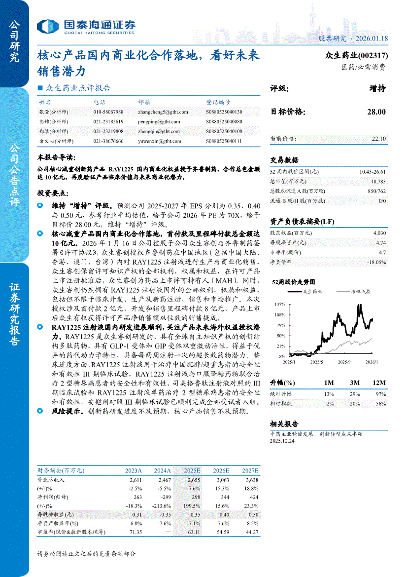 众生药业:国泰海通证券-众生药业-002317-点评报告:核心产品国内商业化合作落地,看好未来销售潜力-260118