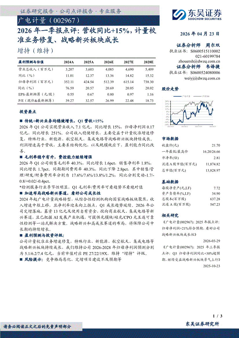 广电计量:东吴证券-广电计量-002967-2026年一季报点评:营收同比+15%,计量校准业务修复、战略新兴板块成长-260423