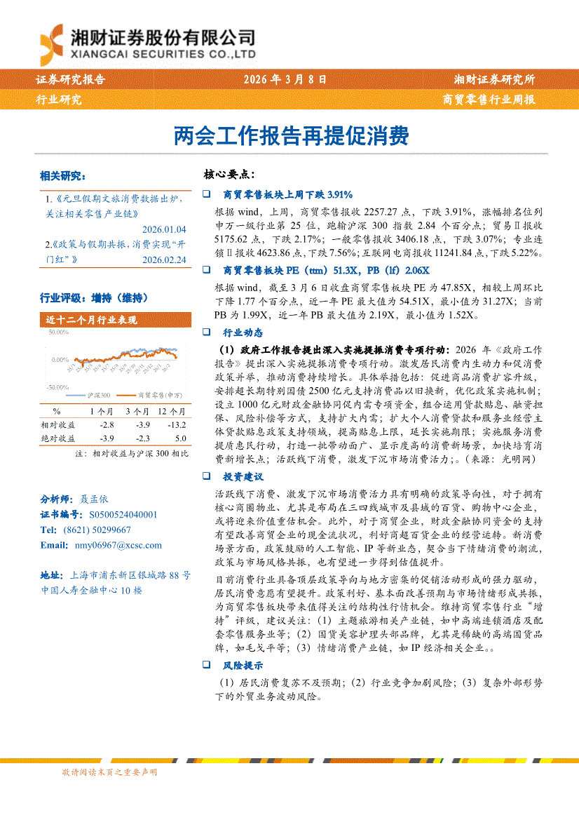 商贸零售行业:湘财证券-商贸零售行业周报:两会工作报告再提促消费-260308