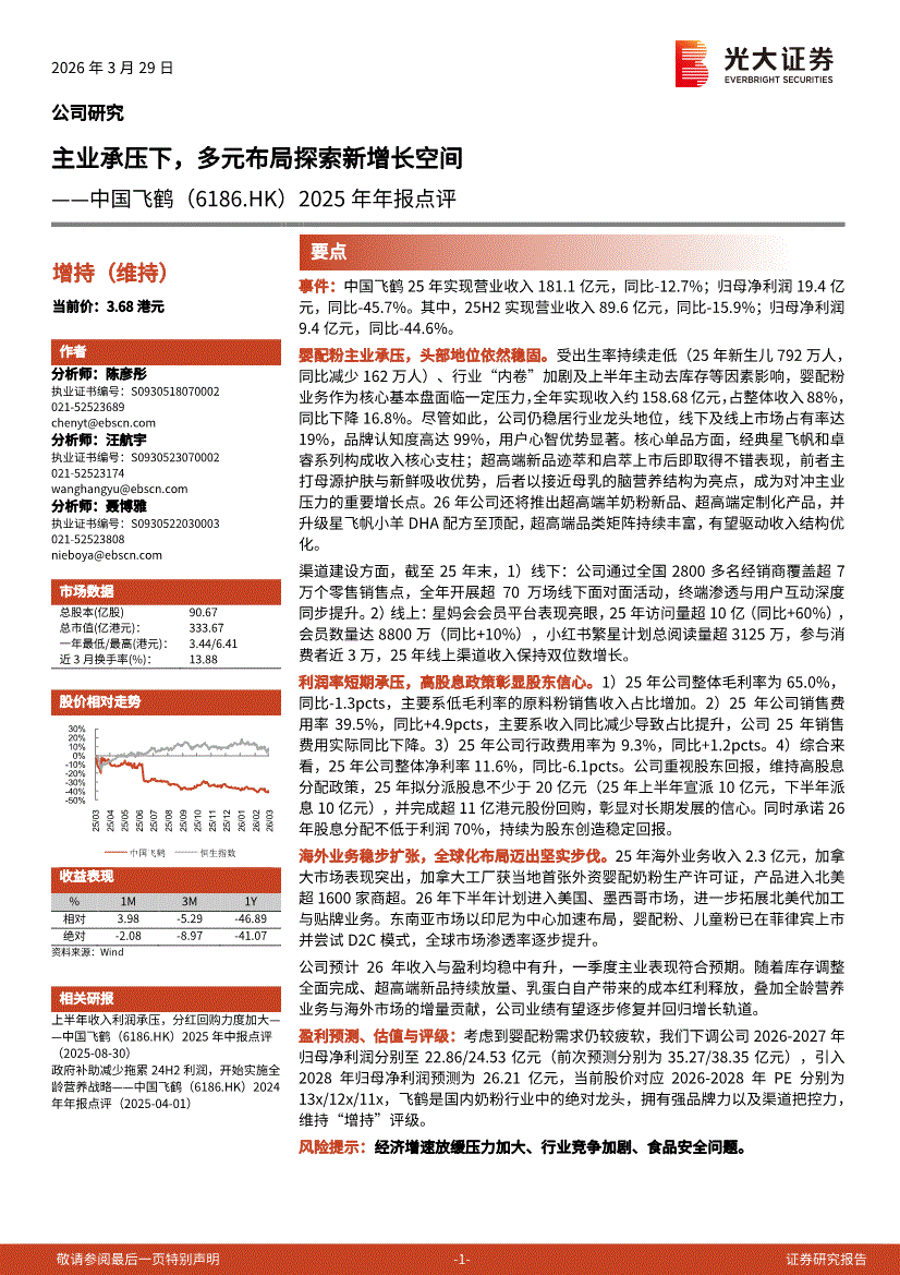 中国飞鹤:光大证券-中国飞鹤-6186.HK-2025年年报点评:主业承压下,多元布局探索新增长空间-260329