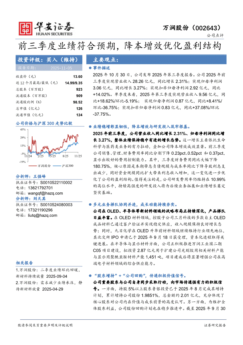 万润股份:华安证券-万润股份-002643-前三季度业绩符合预期,降本增效优化盈利结构-251105