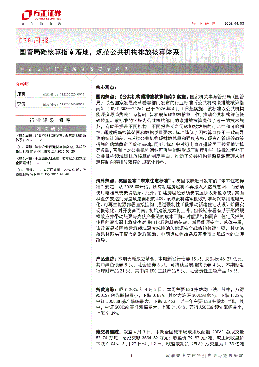 ESG行业:方正证券-ESG行业周报:国管局碳核算指南落地,规范公共机构排放核算体系-260403