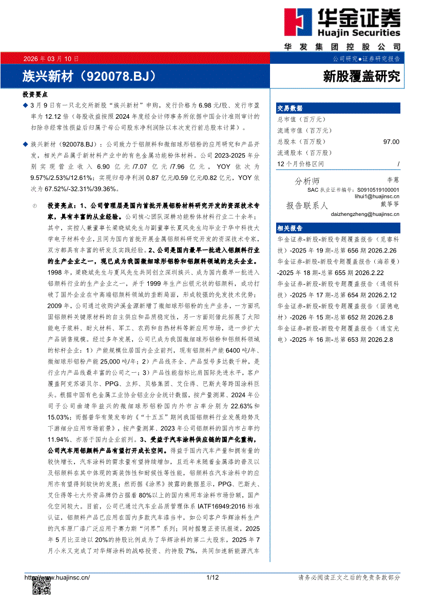 族兴新材:华金证券-族兴新材-920078-新股覆盖研究-260310