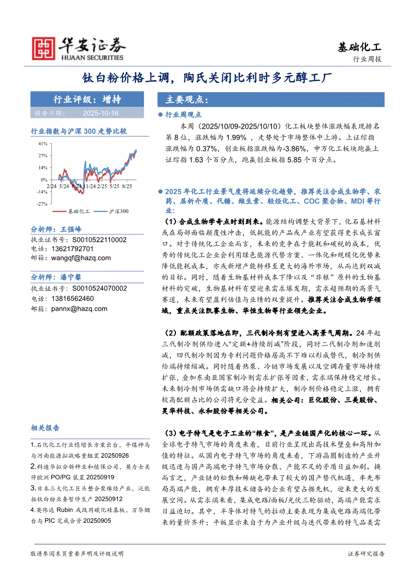 基础化工行业:华安证券-基础化工行业周报:钛白粉价格上调,陶氏关闭比利时多元醇工厂-251016