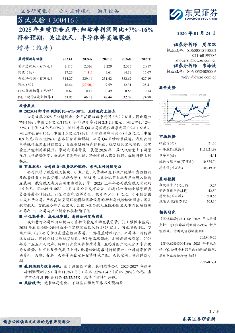 苏试试验:东吴证券-苏试试验-300416-2025年业绩预告点评:归母净利润同比+7%~16%符合预期,关注航天、半导体等高端赛道-260124