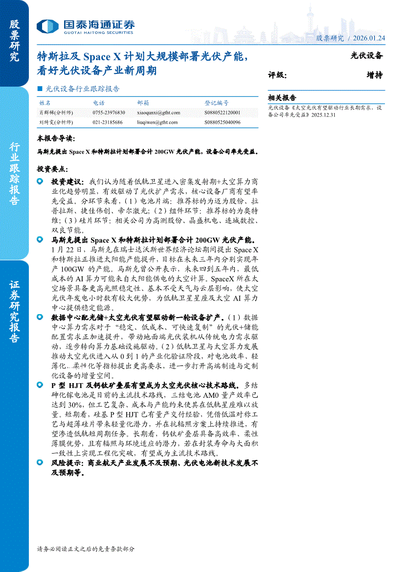 光伏设备行业:国泰海通证券-光伏设备行业跟踪报告:特斯拉及Space X计划大规模部署光伏产能,看好光伏设备产业新周期-260124