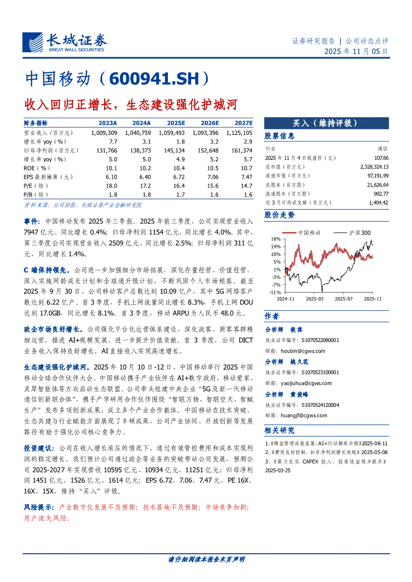 中国移动:长城证券-中国移动-600941-收入回归正增长,生态建设强化护城河-251105