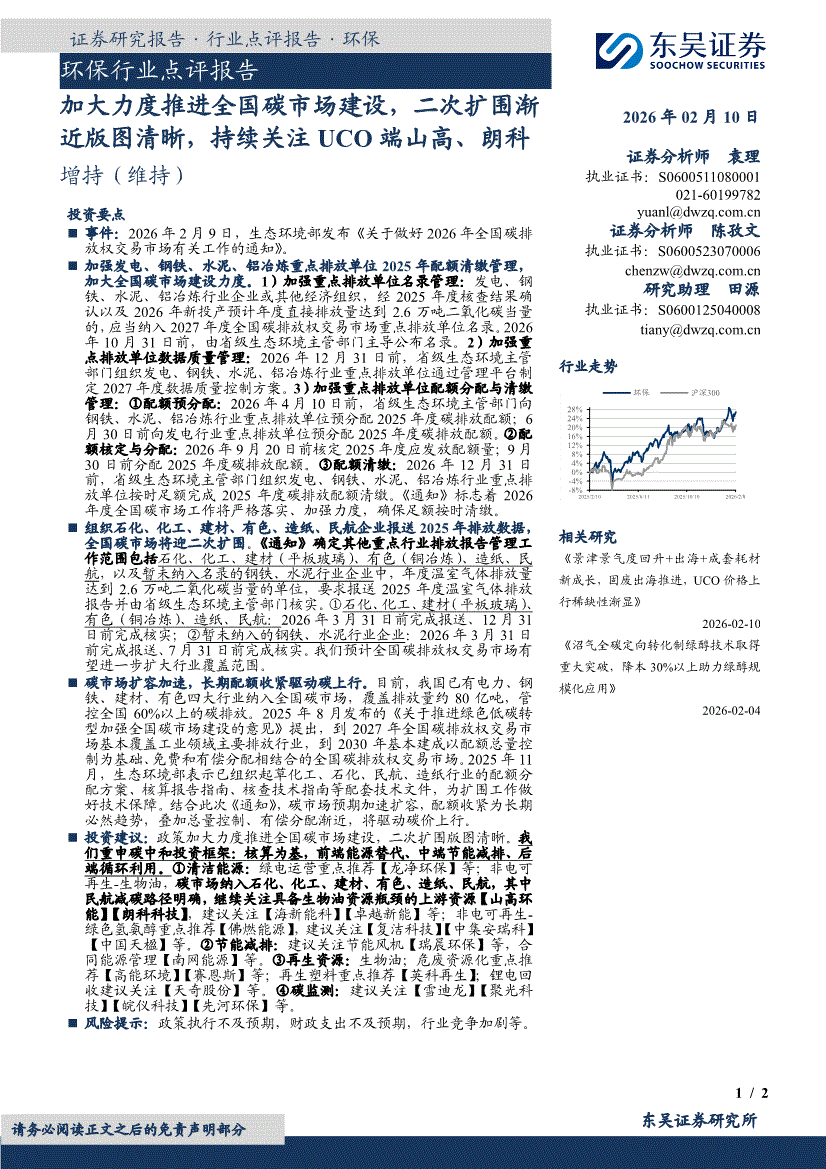 环保行业:东吴证券-环保行业点评报告:加大力度推进全国碳市场建设,二次扩围渐近版图清晰,持续关注UCO端山高、朗科-260210