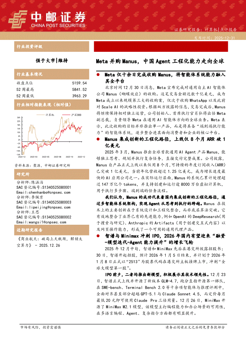 计算机行业:中邮证券-计算机行业点评报告:Meta并购Manus,中国Agent工程化能力走向全球-251231
