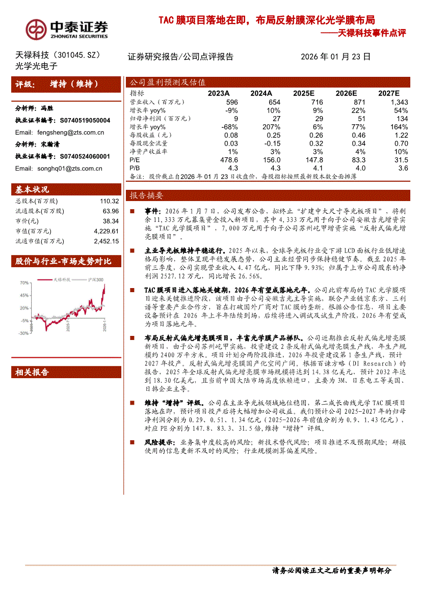 天禄科技:中泰证券-天禄科技-301045-事件点评:TAC膜项目落地在即,布局反射膜深化光学膜布局-260123