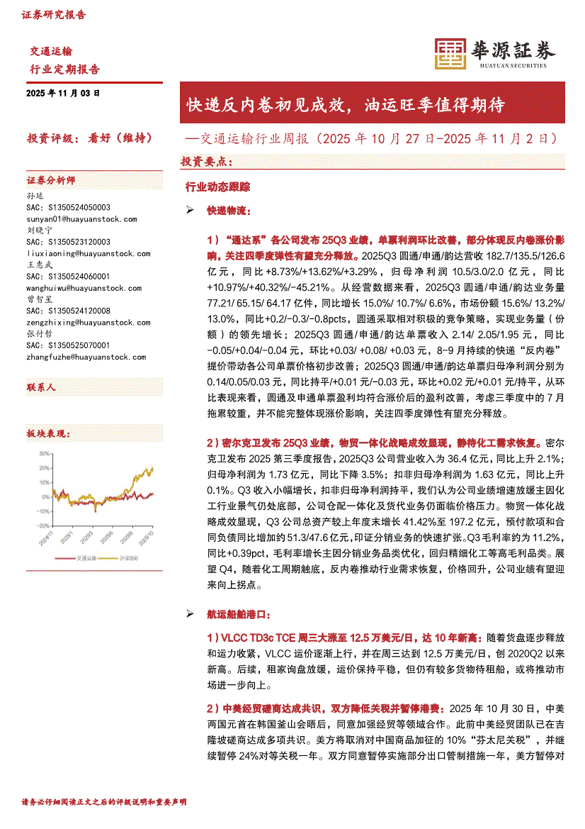 交通运输行业:华源证券-交通运输行业周报:快递反内卷初见成效,油运旺季值得期待-251103