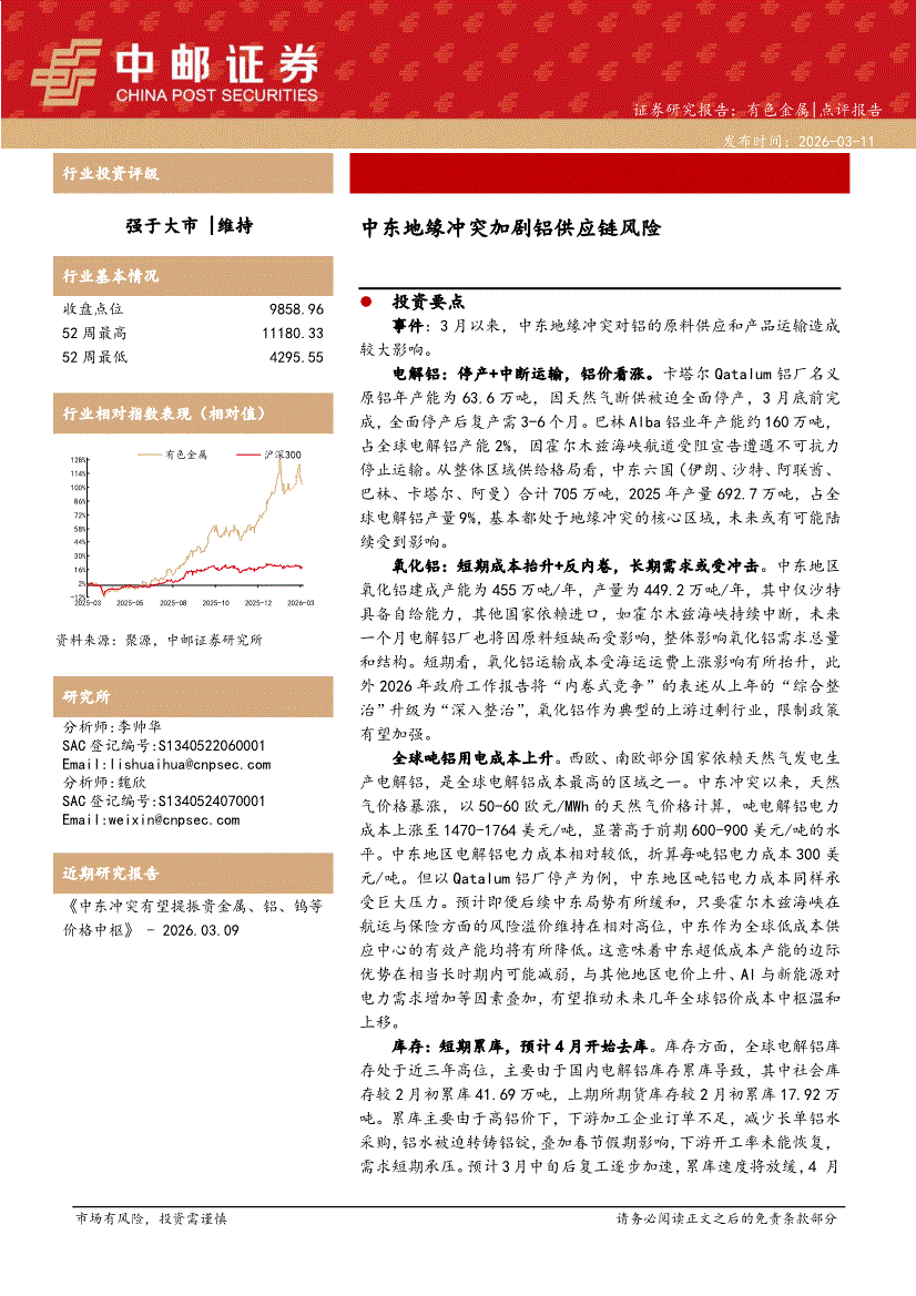 有色金属行业:中邮证券-有色金属行业:中东地缘冲突加剧铝供应链风险-260311