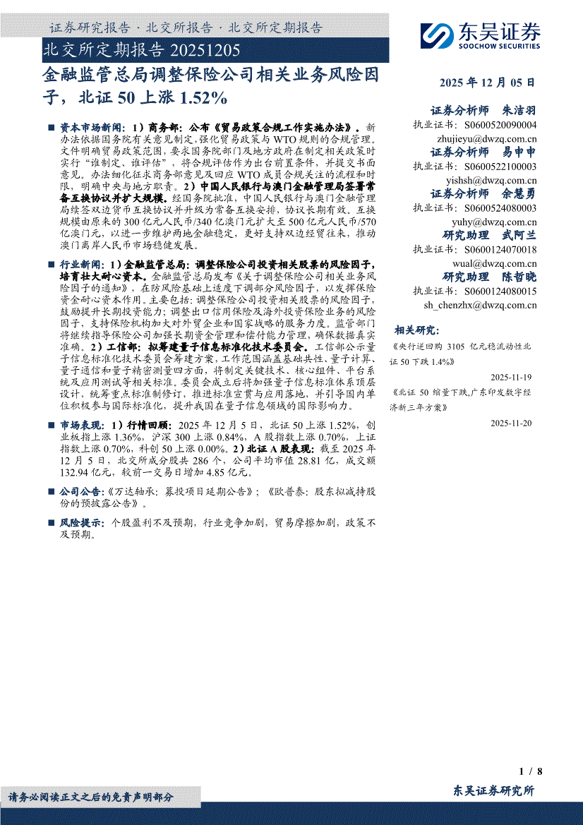 东吴证券-北交所定期报告:金融监管总局调整保险公司相关业务风险因子,北证50上涨1.52%-251205