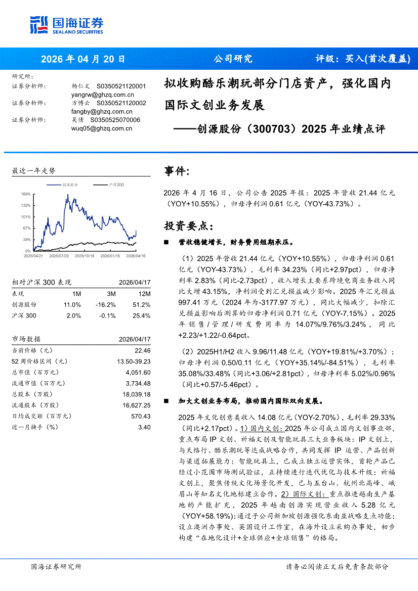 创源股份:国海证券-创源股份-300703-2025年业绩点评:拟收购酷乐潮玩部分门店资产,强化国内国际文创业务发展-260420